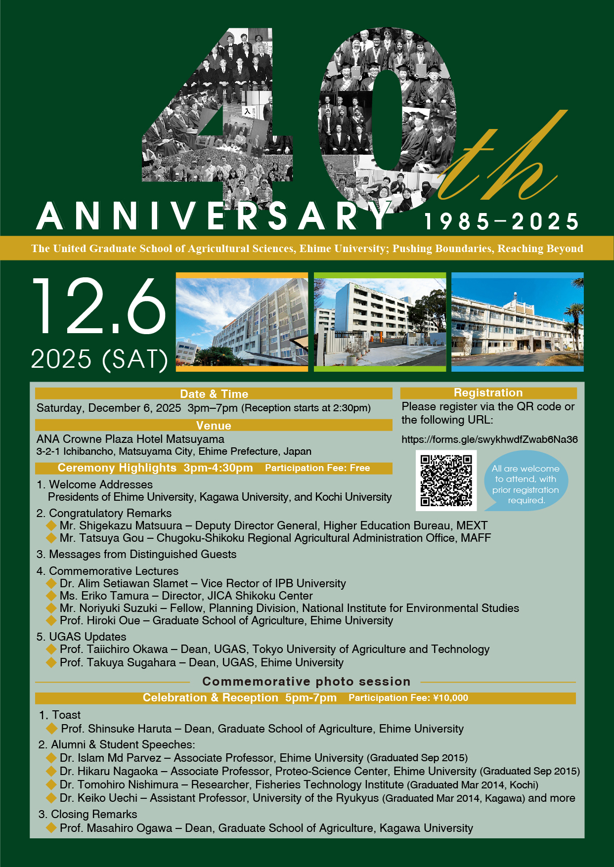 We are delighted to celebrate the 40th anniversary of the United Graduate School of Agricultural Sciences, Ehime University.